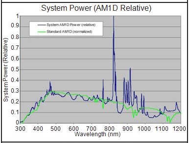 實(shí)際輸出光譜可能會(huì)因燈的狀況和空氣過濾器的制造公差而有所不同。為了簡化我們的太陽模擬器的光譜曲線與ASTM E927-10標(biāo)準(zhǔn)曲線的直觀比較,將模擬器的輸出歸一化為相應(yīng)的標(biāo)準(zhǔn)光譜。