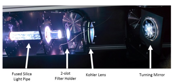 該系統(tǒng)的核心是6500 W氙氣短弧燈和深橢圓形反射鏡,可產(chǎn)生**的光功率并將其重定向到均質(zhì)系統(tǒng)中。使用定制的高度純化的熔融二氧化硅均質(zhì)棒來實現(xiàn)樣品鼓中所需的空間均勻性。均質(zhì)化的光被引導(dǎo)通過Koehler透鏡配置,被轉(zhuǎn)向鏡折回,然后再次被折回并被準直鏡導(dǎo)入樣品鼓。其中一個焦距為3 m的近乎一米直徑的準直鏡是由Sciencetech的一家鏡片供應(yīng)商專門生產(chǎn)的,并經(jīng)過Sciencetech的測試,以確認達到了目標輻照度。